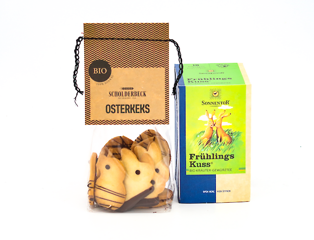 Bio Osterausstecher Dinkel mit Ei, Häsle und Biberle, einen Ostertee "Frohe Ostern" (Bio Tee 18 Beutel einzeln verpackt - Verpackungsbild abweichend) von Sonnentor
